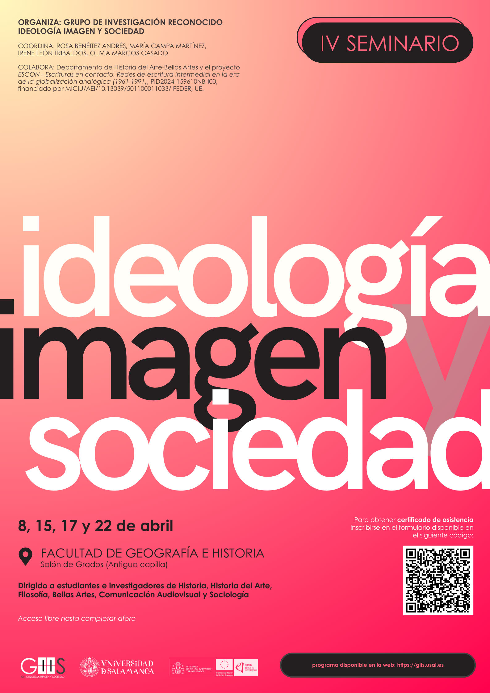 El grupo de investigación Ideología, Imagen y Sociedad organizamos nuestro II Seminario anual los próximos días 6, 13, 15 y 20 de marzo en la Facultad de Geografía e Historia de la USAL. Os invitamos a que le echéis un vistazo al programa: todas las sesiones son de libre acceso y podéis solicitar un certificado de asistencia en el siguiente formulario.